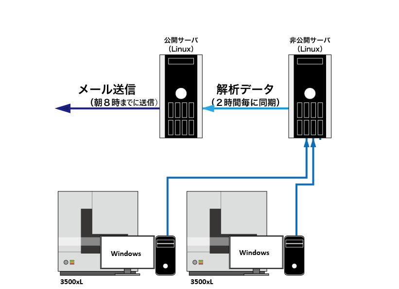 ABI3500の解析データはLANを通して非公開サーバに保存され、公開サーバへ2時間ごとに同期されます。